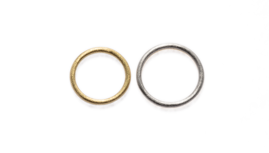 お互いのリングの上下を半分こしたような形で着け方によって変わる表情を楽しめます