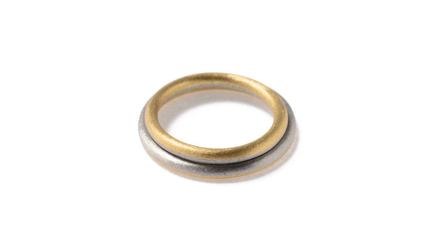 お互いのリングの上下を半分こしたような形で着け方によって変わる表情を楽しめます